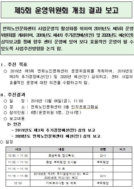 2019년 제5회 운영위원회 사회복지법 제36조 및 시행규칙 제24조에 의거하여 아래와 같이 개최하였습니다.