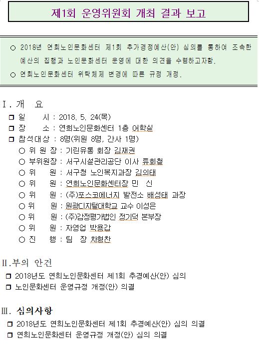 2018년 제1회 운영위원회 사회복지법 제36조 및 시행규칙 제24조에 의거하여 아래와 같이 개최하였습니다.
