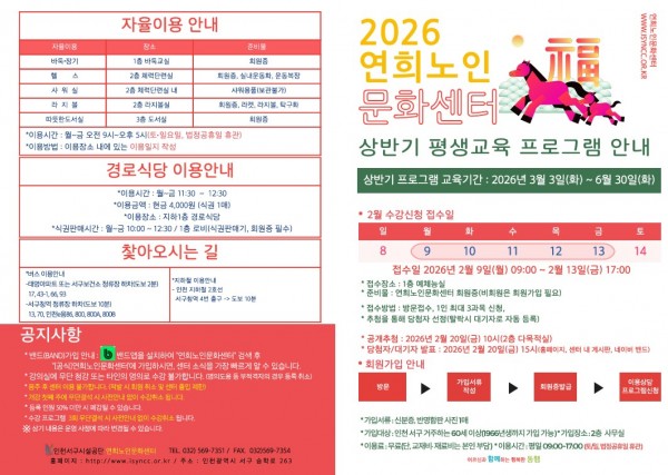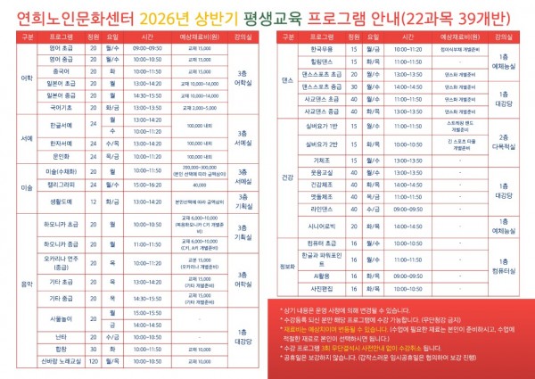 2026년 상반기 평생교육 프로그램 시간표 페이지 정보 작성자 관리자 댓글 0건 조회 378회 작성일 26-02-06 13:16 본문 목록 이전글2026년 전문상담 운영 안내 다음글2025년 노인건강체조교실 9988 모집 댓글목록 댓글목록 등록된 댓글이 없습니다.